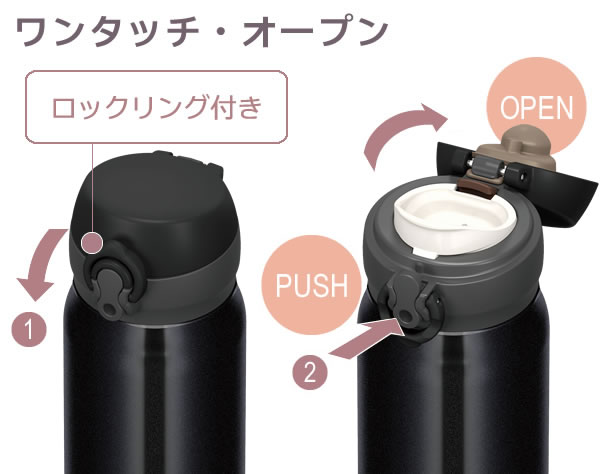 ワンタッチオープンキャップは片手で簡単ワンタッチオープン、そのまま飲めます。