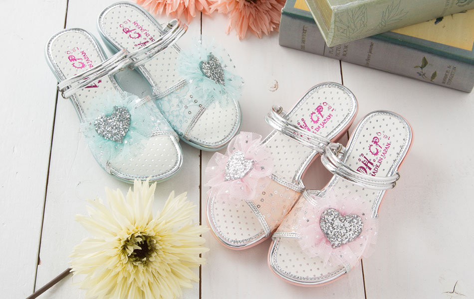 ビビットなカラーでカッコかわいくキマる! ドット柄のキラキラサンダル item Name それぞれビビットなカラーが目を引くキラキラサンダル、足先のハートのモチーフとリボンが子供らしい可愛さを醸し出します。